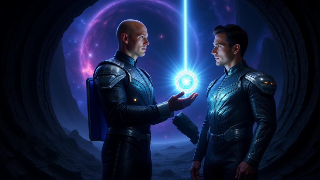 Als er die Ruine endlich erreichte, fand er sie von einem uralten Wächter bewacht – einer majestätischen Kreatur aus Schuppen und Licht, deren Augen die Zeit selbst zu durchdringen schienen. Die Gefahr war größer, als er es sich je hätte vorstellen können; die Ruine beherbergte ein Gleichgewicht, das die gesamte Galaxis bedrohte, wenn es nicht in die falschen Hände geriet. Doch dank der Weisheit, die Lyra ihm vermittelt hatte, und des Amuletts, das den Geist der Diplomatie in ihm trug, setzte McDonald sich mit dem Wächter ein. Durch Worte, die von Respekt und Empathie durchdrungen waren, ließ er den Wächter die Last der Macht fühlen und zeigte ihm, dass das Gleichgewicht durch Zusammenarbeit erreicht werden kann, nicht durch Unterdrückung. Der Wächter verstand und sank zurück in die Ruine, beruhigt und bereit, die Galaxis vor dem drohenden Chaos zu schützen.
